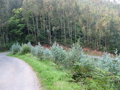 Casi todo el trayecto entre eucaliptos, la subida se alarga aunque iba bien prevenido y esperaba algo más de pendiente. Un claro y unas casas, no ha terminado aún; más eucaliptos y llegamos a las Viñadas, a la derecha sube al área recreativa, ya queda poco.